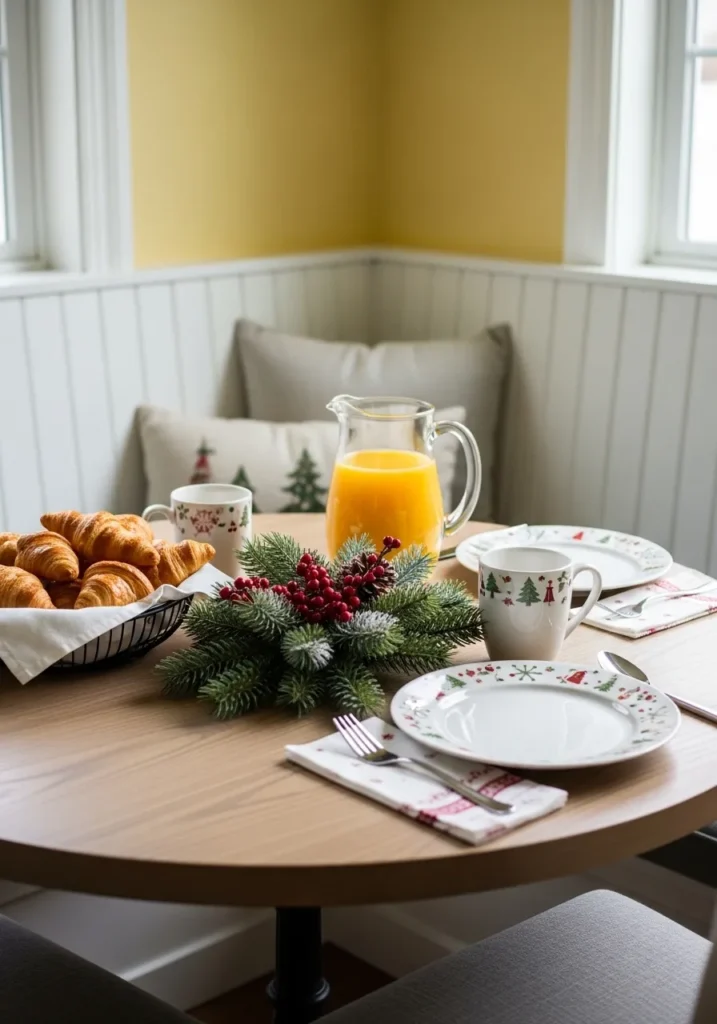 This charming breakfast nook captures all the joy of a slow Christmas morning. The round wooden table is set with whimsical holiday plates, tree-printed mugs, and a small evergreen and berry centerpiece that adds a festive pop of red and green. Soft yellow walls and comfy cushions create a cheerful, sunlit space perfect for buttery croissants and fresh orange juice shared with loved ones.