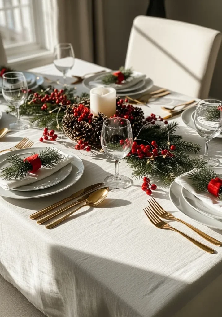 I think what makes this design so impressive is how perfectly the white and gold combination highlights the traditional holiday red and green—it just makes the colors pop! The way the morning sunlight is streaming across the table, creating those lovely shadows, gives the whole scene such a warm and inviting glow, making the setting feel so intimate. It’s a wonderful reminder that focusing on a few classic textures, like linen, gold, and natural greenery, is the key to creating an effortlessly chic and joyful holiday table.