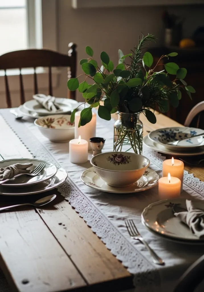 This table setting feels like a cozy holiday dinner straight from a countryside cottage. The vintage-inspired plates, linen napkins, and glowing candles bring warmth to the rustic wooden table, while a vase filled with leafy greens adds that fresh, natural touch. Everything feels inviting, from the flickering candlelight to the timeless charm of the lace-trimmed runner.
