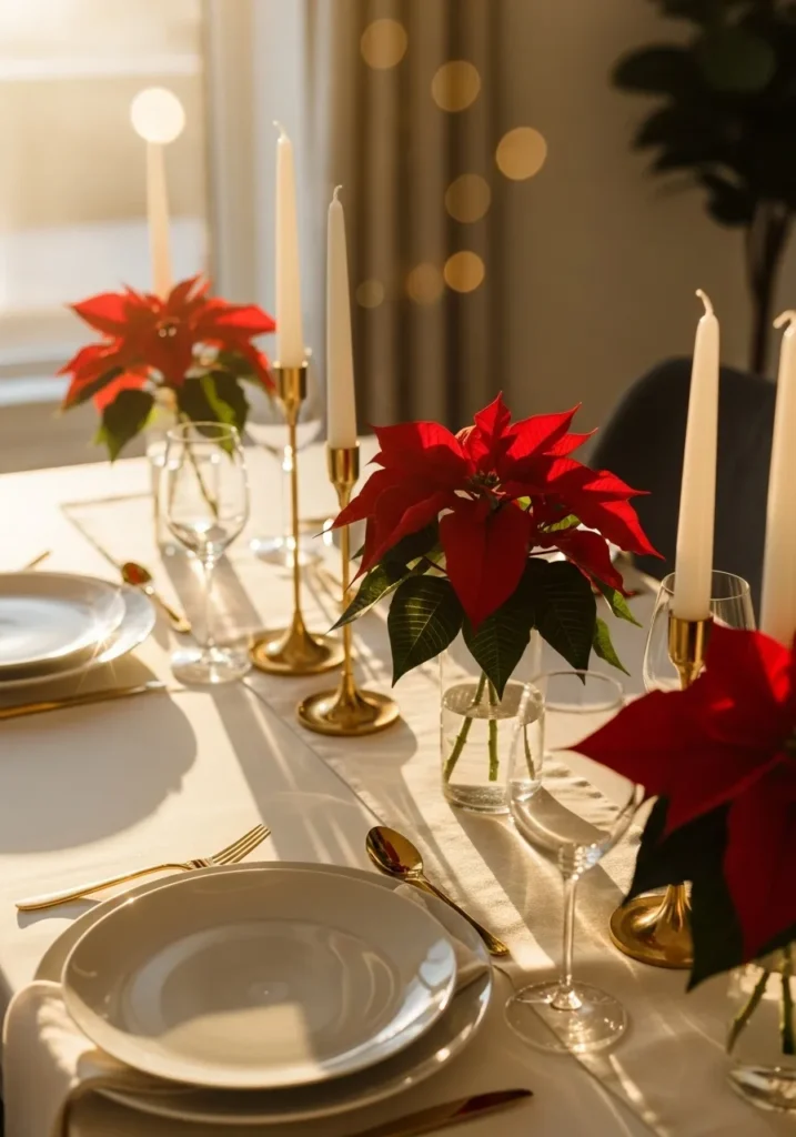 I think what makes this table so special is how it balances simplicity and luxury. The white and gold combo feels classic, while the poinsettias bring that joyful Christmas spirit. It’s the kind of setup that makes even a casual brunch feel like a celebration.