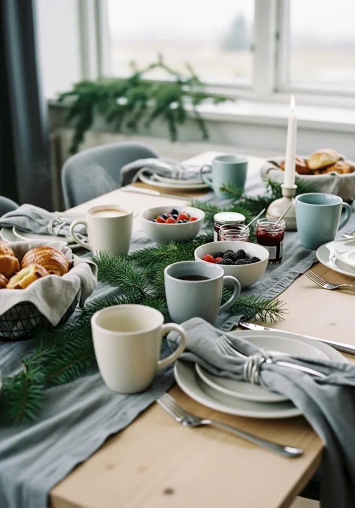 This table brings a cool, cozy Scandinavian vibe to Christmas morning. Muted gray linens, simple white dishes, and touches of evergreen make it feel fresh and modern yet perfectly warm. The steam rising from coffee mugs and the soft candlelight create such a serene atmosphere—like the calm after the first snowfall.