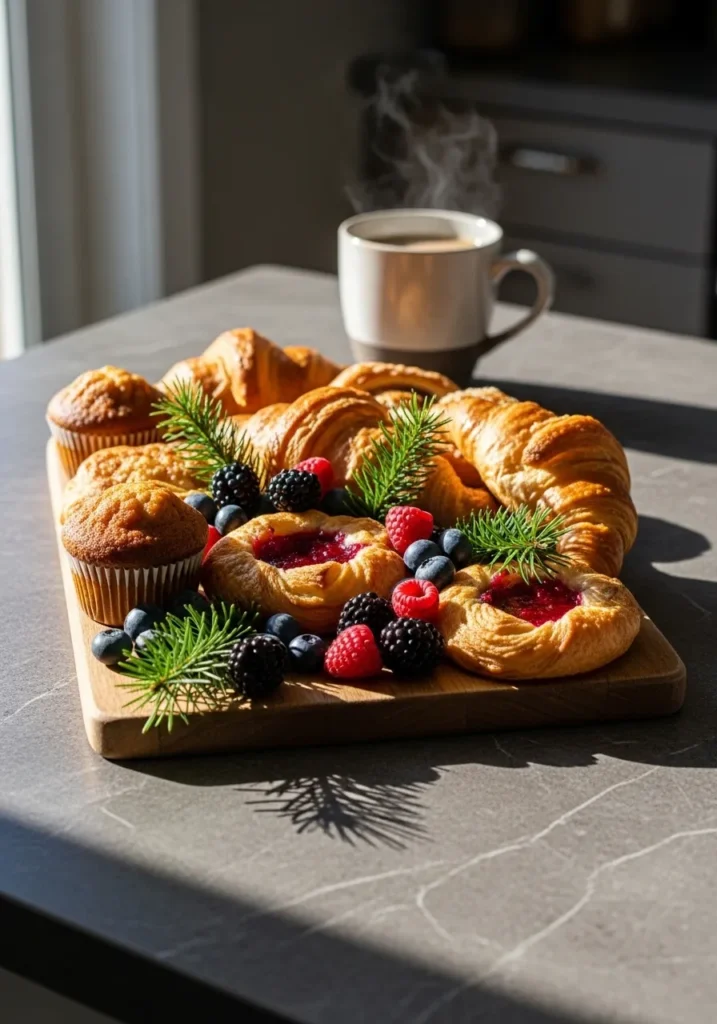 Golden croissants, fluffy muffins, and jewel-toned berries make this breakfast spread feel like a sweet holiday dream. The wooden serving board, accented with little sprigs of pine, brings a rustic Christmas touch that’s both simple and stunning. You can almost smell the fresh pastries and coffee filling the room.
