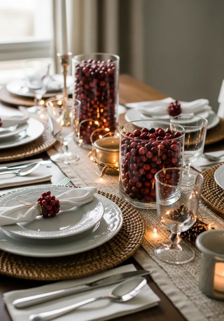 This table captures the heart of holiday cheer with its rich cranberry accents and warm candlelight. Glass vases filled with cranberries add a creative twist to the centerpiece, while woven placemats and fairy lights tie everything together beautifully. It feels both rustic and refined—like something out of a Christmas storybook.