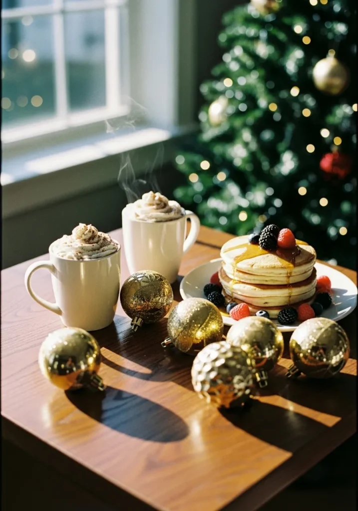 This cozy table setup feels like pure Christmas morning happiness. A stack of fluffy pancakes drizzled with syrup sits beside steaming mugs of whipped-cream-topped cocoa, surrounded by glimmering gold ornaments that catch the soft morning light. The background sparkles with a beautifully lit tree, making the whole scene glow with that dreamy, festive warmth. It’s simple, charming, and totally breakfast goals.