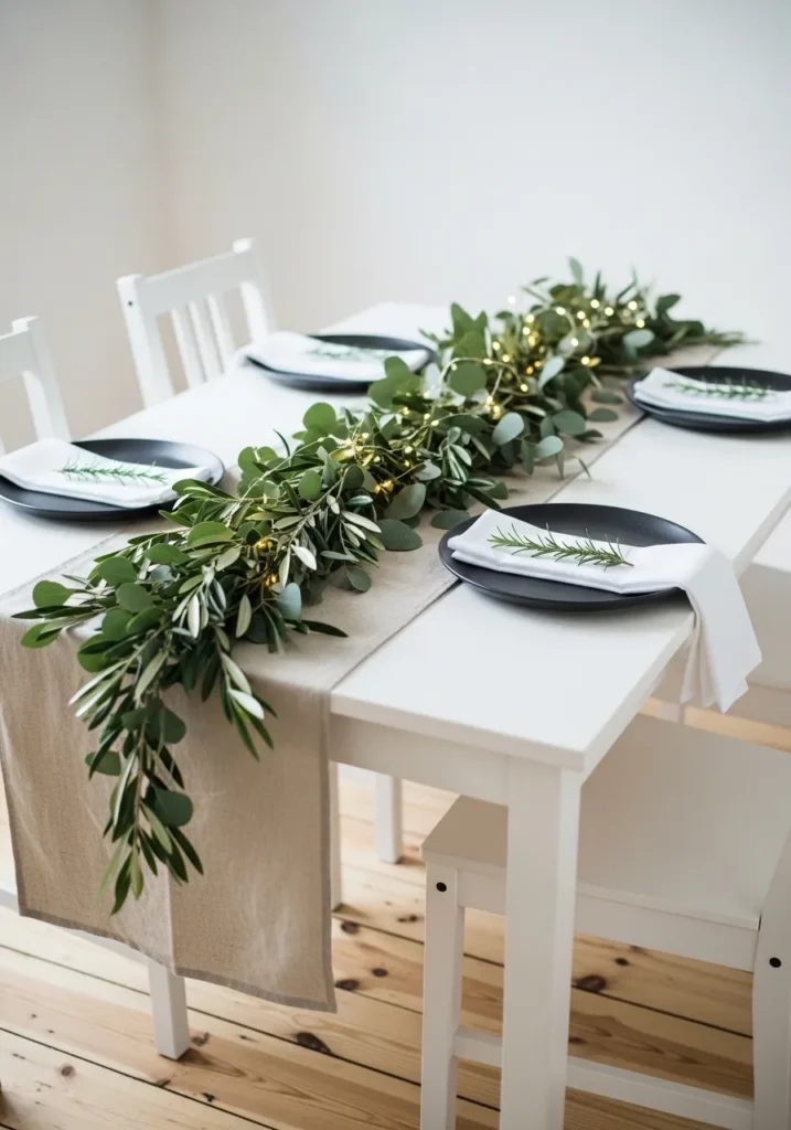 This table design proves that less really can be more. A fresh garland of eucalyptus and olive leaves runs down the center, dotted with delicate fairy lights that add just the right amount of twinkle. Each place setting is simple yet stylish, with crisp white napkins and a single sprig of rosemary that gives everything a fresh, organic feel.