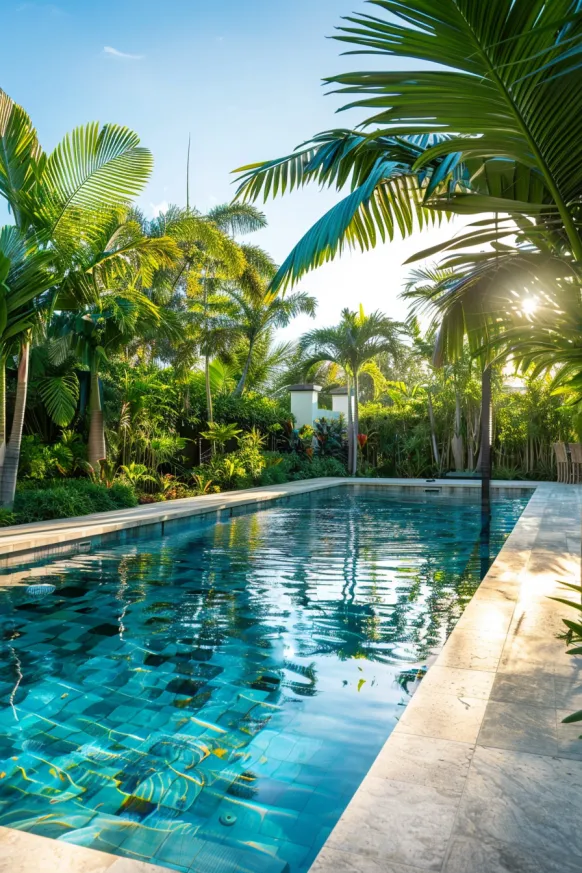 This stunning in-ground pool design offers a serene, tropical escape. Surrounded by lush greenery, palm trees, and vibrant plants, the pool area creates the perfect outdoor haven for relaxation. The clear blue water contrasts beautifully with the natural foliage, making this space feel like your very own private paradise. The pool’s clean lines and modern stone border add a sophisticated touch, while the sunlight streaming through the trees creates a warm, inviting glow.