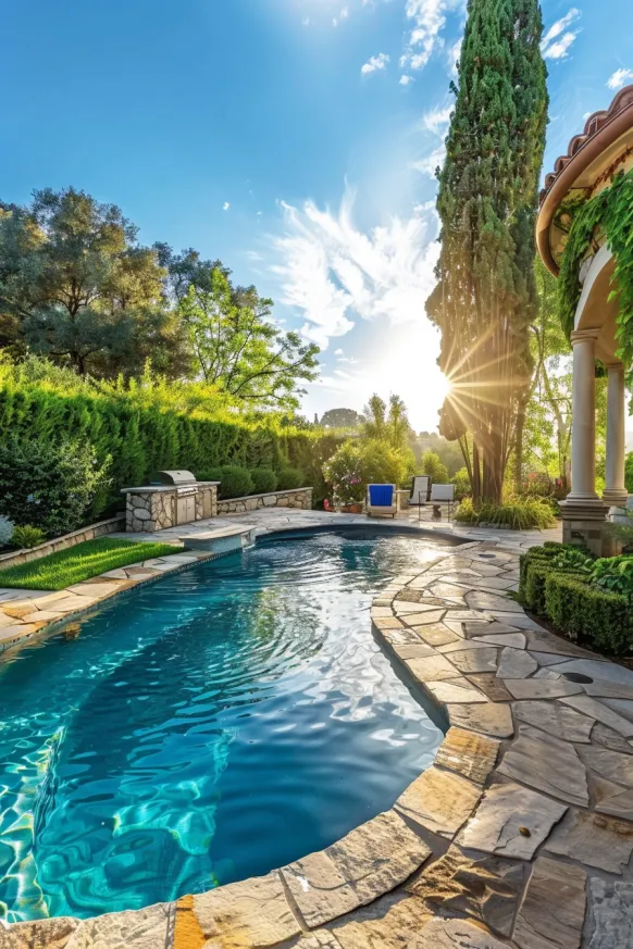 This pool design exudes warmth and tranquility with its soft stone edging and lush greenery surrounding the area. The curved shape of the pool adds a more organic feel, seamlessly blending with the natural landscape. On one side, the elegant stone wall and surrounding greenery offer privacy, while the sun casts a soft glow over the space, creating a peaceful retreat. The inclusion of outdoor furniture next to the pool makes it the perfect place for relaxing or entertaining guests.