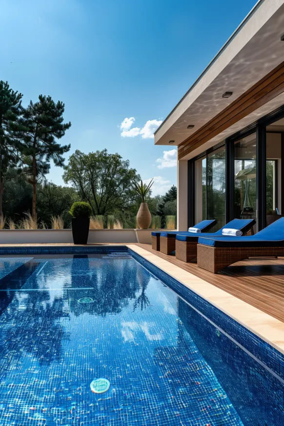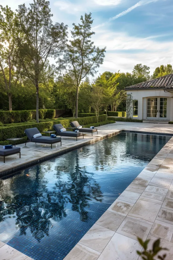 This charming pool area is surrounded by lush greenery, creating a serene, private escape right at home. The sleek, rectangular pool features a mosaic of deep blue tiles that reflect the clear sky above, while the surrounding marble tiles give the space a luxurious, polished look. The perfectly placed loungers along the edge invite relaxation, making it a perfect spot for sunbathing or enjoying a cool drink on a warm day. The elegant hedges and trees provide a natural barrier, enhancing the peaceful ambiance of the space.