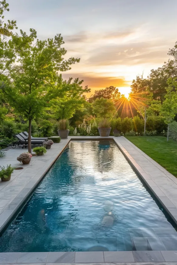 This sleek, rectangular pool design is perfectly framed by tall trees and lush landscaping, creating a sense of calm and privacy. The clean lines of the pool are complemented by minimalist stone tiles that reflect the tranquil water and surrounding greenery. Large planters filled with vibrant plants add a touch of color, while lounge chairs invite relaxation under the open sky. The crowning feature, of course, is the stunning sunset view that bathes the space in golden light, making it the perfect spot for evening gatherings.