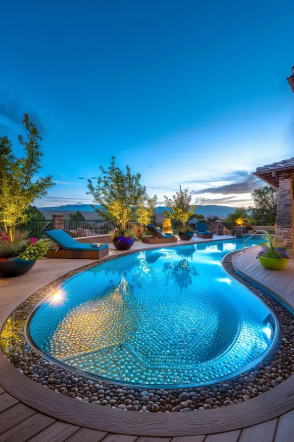 This gorgeous pool design is perfect for evening relaxation. The illuminated, multi-colored tiles in the pool create a shimmering effect as the sun sets. The pebble-lined edges and sleek, rounded shape of the pool blend beautifully with the surrounding wooden decking, which offers ample space for lounge chairs. The strategically placed plants in colorful pots and soft lighting enhance the atmosphere, giving the pool a magical, intimate feel, especially as twilight sets in.