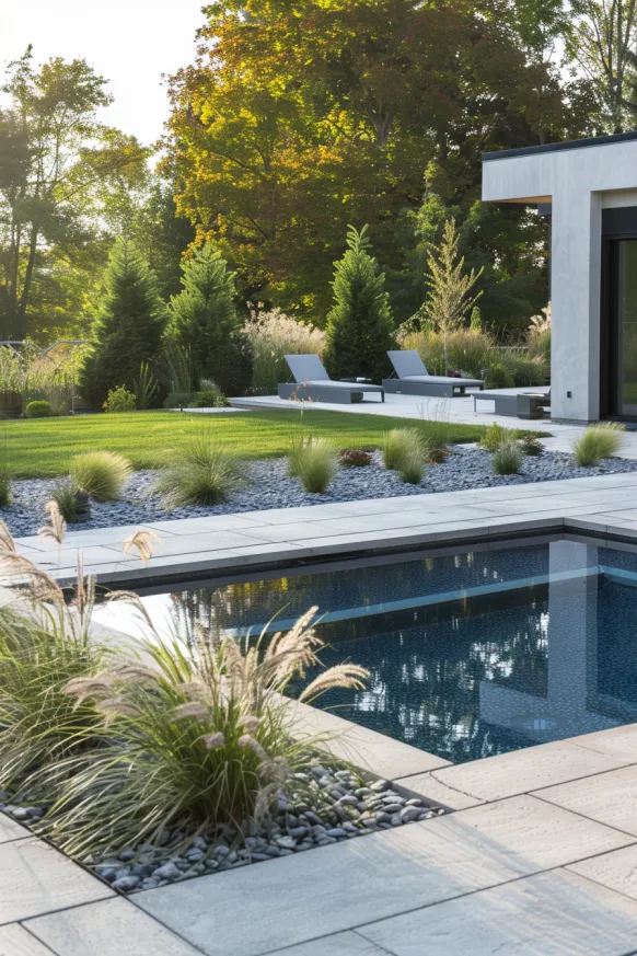 This sleek, minimalist pool design is surrounded by simple yet beautiful landscaping. The rectangular pool features sharp, clean lines that give it a modern feel, while the natural elements, such as grasses and shrubs, soften the overall look. The light-colored stone tiles and smooth pebbles surrounding the pool create a clean and airy vibe. With carefully selected plants adding pops of greenery, the design effortlessly blends with its environment, making it perfect for those who appreciate simplicity and style.