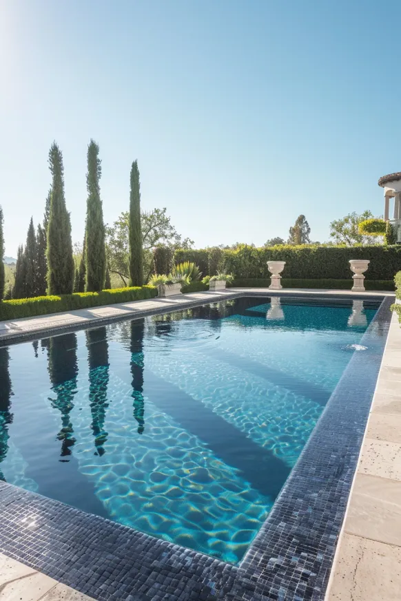 This stunning poolside design is perfect for anyone looking to create a luxurious outdoor living space. The pool, surrounded by elegant stone tiling, reflects the greenery around it, giving it a serene and inviting vibe. Tall, slender cypress trees line the edge, adding height and privacy while offering a beautiful contrast to the soft, tranquil water. A sleek lounge chair sits nearby, just waiting for someone to unwind with a refreshing drink.