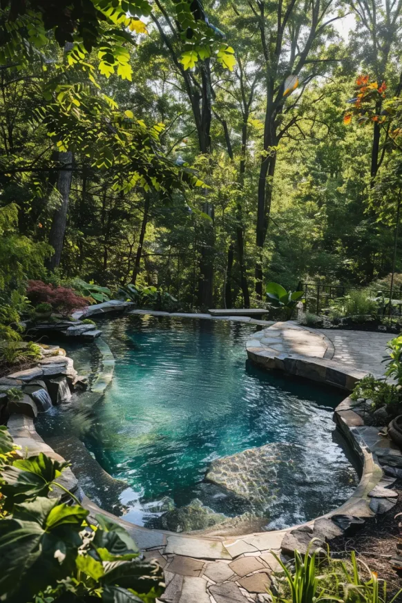 What I adore about this design is how it seems to harmonize with nature. It’s not just a pool—it’s an experience, a place where you can feel at one with the forest. The earthy materials and the surrounding foliage create such a peaceful, private setting. This is the perfect spot for anyone who dreams of a retreat that feels like an escape into nature without sacrificing luxury. It’s a dream come true for a quiet day in the sun!