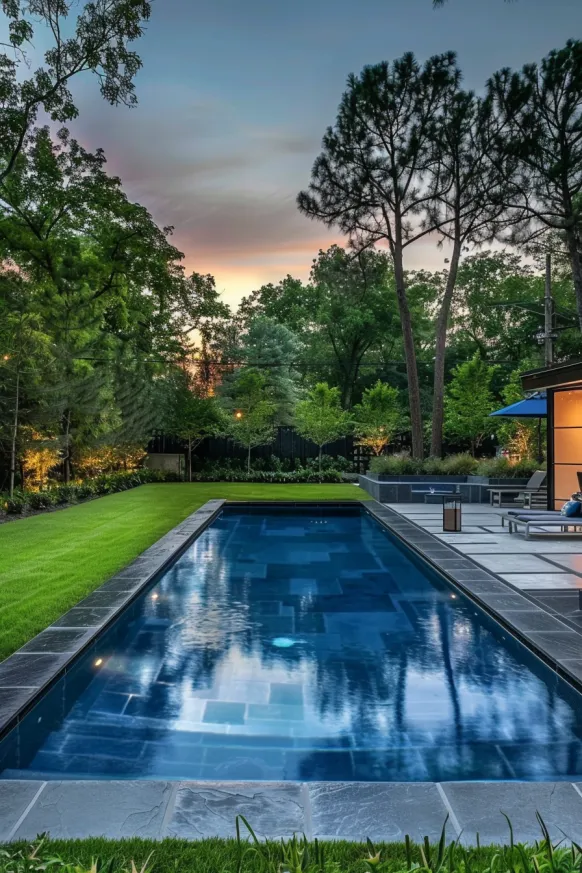I absolutely love this setup for its perfect blend of modern sophistication and natural beauty. The clean lines of the pool, paired with the natural elements like the trees and greenery, create a peaceful, serene space that’s perfect for relaxation. It’s an outdoor sanctuary that feels like an oasis right in your backyard!