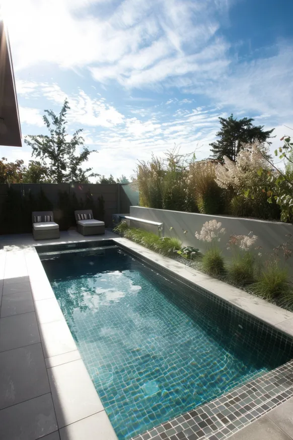 This sleek, modern pool is perfectly integrated into an urban setting, framed by a minimalist stone wall and neatly trimmed landscaping. The narrow pool has clean, straight edges and is surrounded by contemporary tiles, giving it a sharp and sophisticated feel. The pool’s deep blue tiles contrast beautifully with the pale stone deck and lush greenery, creating a perfect balance of calm and elegance. The simple lounge chairs provide a comfortable spot to relax and soak in the surroundings.