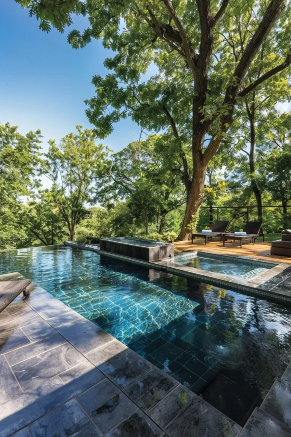 I absolutely adore how this design connects so beautifully with nature. The trees offer privacy while keeping the space airy and open, and the subtle waterfall feature brings a touch of zen to the entire vibe. It’s the kind of pool you want in your backyard if you’re dreaming of a tranquil escape right at home. The contrast of the dark tiles against the greenery makes the whole space look sleek yet cozy, and who wouldn’t love to lounge by a pool like this? It truly feels like a private getaway in the middle of the outdoors!