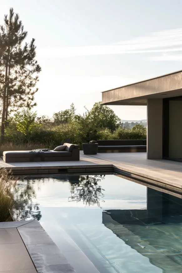 This modern pool design is surrounded by sleek, minimalist architecture and subtle landscaping. The pool has clean lines and is framed with large, simple tiles, creating a seamless transition from the pool to the surrounding patio area. The neutral tones of the tiles and furniture help keep the focus on the serene water, with soft reflections of the surrounding trees and sky adding to the peaceful atmosphere. A stylish, low-profile seating area is placed beside the pool, perfect for enjoying a quiet moment or entertaining guests.