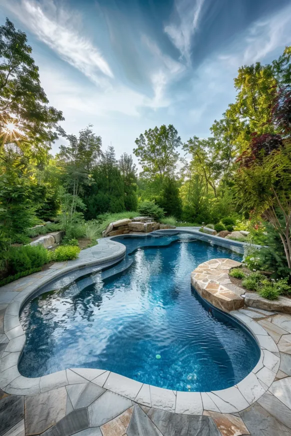 This pool design is like stepping into a hidden oasis, with its flowing, organic shape surrounded by lush greenery. The natural stone elements create a rustic yet elegant atmosphere, with large, flat stones lining the edges of the pool. A beautiful waterfall feature adds movement and sound, enhancing the tranquil vibe of the space. The surrounding trees and plants add a lush touch, creating a perfect balance of nature and design.