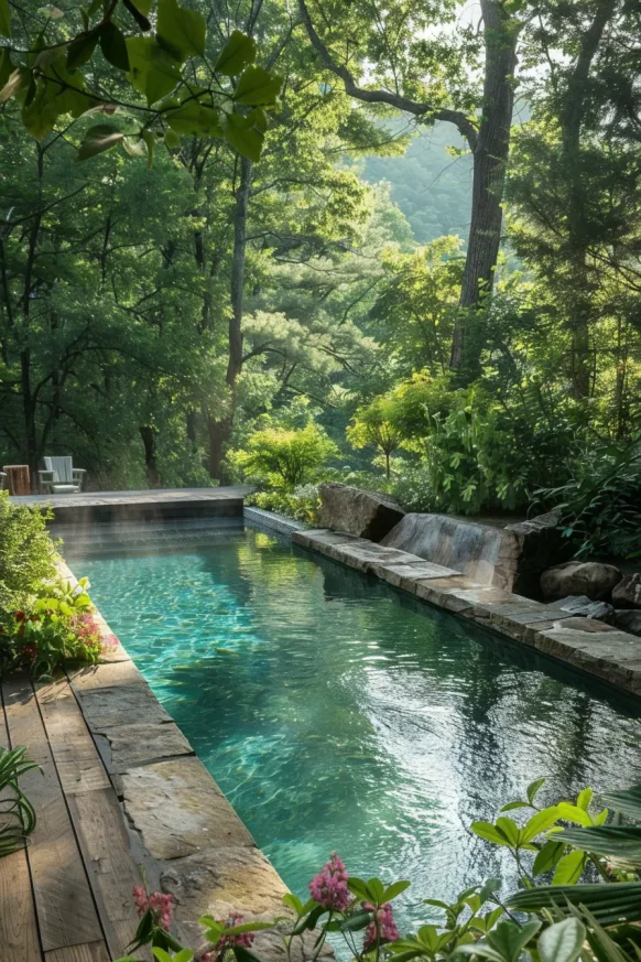 This pool design feels like a hidden sanctuary nestled within the woods. The stone-lined pool gently blends into its lush surroundings, with trees towering over and creating a serene, almost magical vibe. Soft morning mist rises from the water, adding to the tranquil ambiance. A wooden deck frames the pool, perfectly complementing the natural stone elements, while vibrant flowers add splashes of color to the lush greenery.
