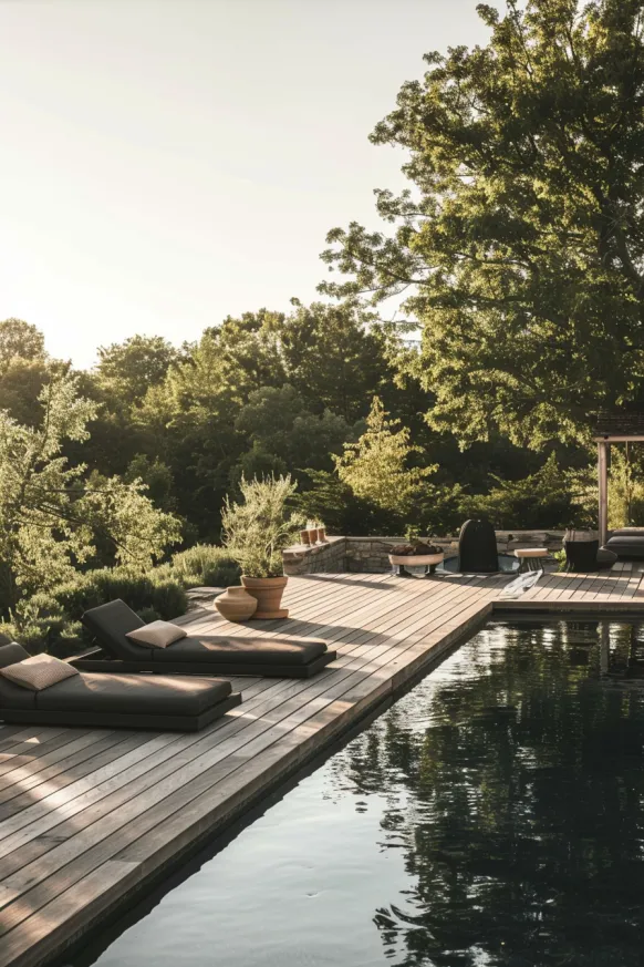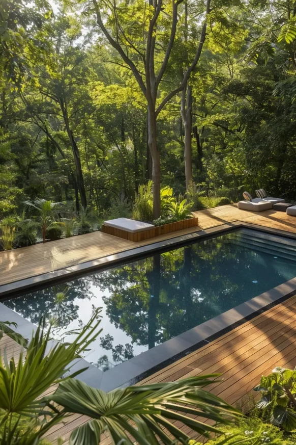 I absolutely love how this pool design feels like a hidden gem tucked away in nature. The balance of natural wood and modern design creates such a soothing, inviting atmosphere. It’s the kind of space where I can totally imagine myself sipping iced tea and reading a book, surrounded by the sounds of rustling leaves and chirping birds. This design is perfect for anyone who loves the idea of a serene, nature-inspired escape right at home. It’s both calming and chic—what more could you ask for?