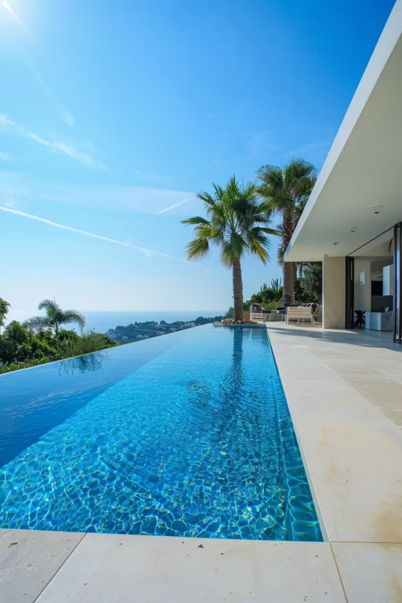 This jaw-dropping infinity pool offers an uninterrupted view of the ocean, blending beautifully with the sleek, modern architecture of the house. The clear, inviting water of the pool appears to spill over the edge, creating a stunning visual effect that seamlessly connects the pool with the horizon. Framed by palm trees and minimalist stone tiles, the pool’s clean lines and simple design give it a contemporary, yet tranquil vibe, making it the perfect place to relax and unwind.