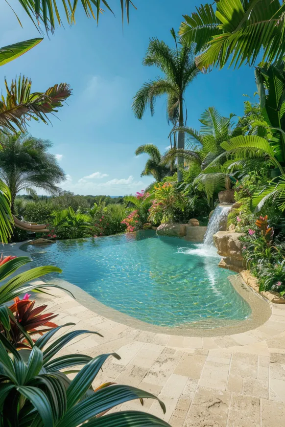 This pool design takes full advantage of its tropical surroundings, with lush palm trees and vibrant greenery framing the space. The pool itself has a freeform shape, with natural stone tiles that mimic the look of a lagoon or river, creating an exotic, relaxed atmosphere. Luxurious loungers are placed near the water’s edge, inviting you to unwind and soak in the tropical vibes. The stunning blue waters shimmer under the sunny sky, making this an irresistible spot to relax and enjoy the beauty of nature.