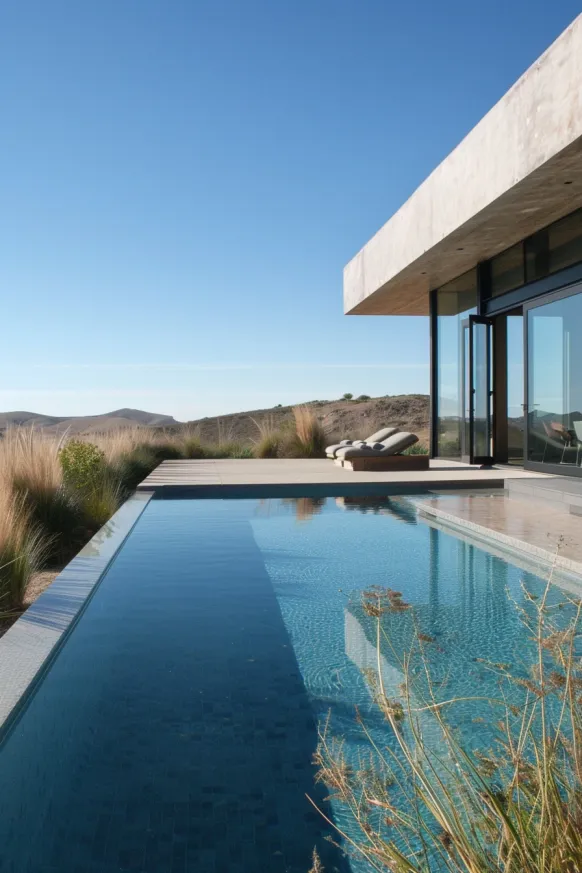 This pool design features a sleek, modern style that seamlessly integrates with the landscape. Set against a backdrop of vast open space and rolling hills, the pool’s clean lines and understated elegance create a sophisticated focal point. The neutral stone tiles surrounding the pool tie the design together, while the expansive glass walls of the house open up to the incredible outdoor scenery. The simple, open space exudes a sense of calm and tranquility, making this an ideal setting for those who appreciate a minimalist aesthetic.