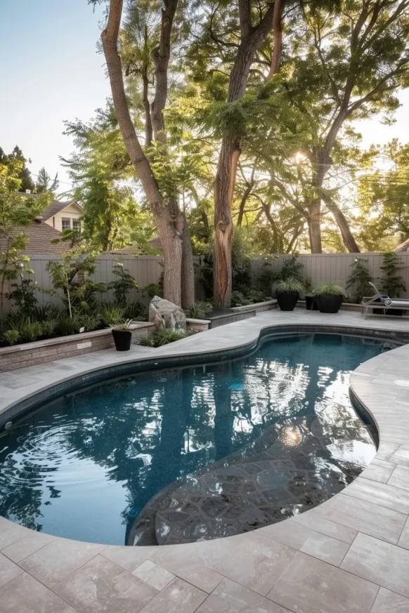 This in-ground pool design features a relaxing, natural vibe with lush trees framing the space and giving it a sense of privacy and tranquility. The pool’s curved edges mirror the organic lines of the landscape, while the surrounding stone tiles add a rustic charm. Strategically placed potted plants bring pops of greenery, and the warm evening light creates a soft, inviting glow around the entire pool area. The close proximity to the trees enhances the sense of being surrounded by nature.