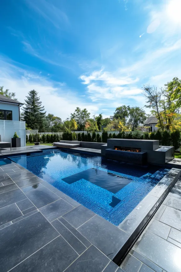This pool design takes modern luxury to the next level with its striking, geometric shape and sleek black tiles. The fire pit integrated into the pool’s structure adds a touch of warmth and drama, perfect for cozy evenings. The surrounding patio area features minimalist seating, creating a chic and inviting space. The vibrant blue water contrasts beautifully with the darker tones of the stonework, while the clean lines and sharp angles of the design give the whole area a contemporary, high-end vibe.