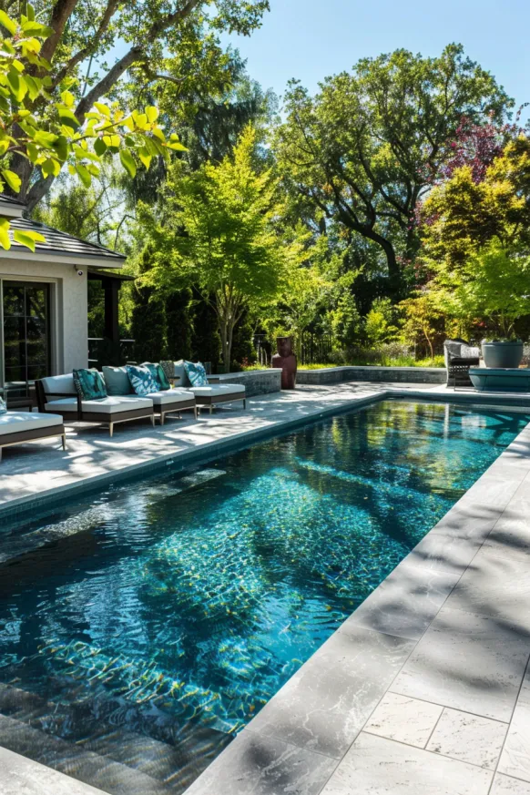 This stunning in-ground pool design is nestled within a beautiful garden oasis, surrounded by tall trees and rich greenery. The sleek, modern pool features clean lines and a tranquil blue hue that perfectly complements the lush plants around it. The minimalist lounge area with plush seating adds a cozy touch, making it an ideal spot for relaxing and enjoying the serene environment. The natural stone tiles around the pool further enhance the sophisticated yet relaxed vibe of the space.