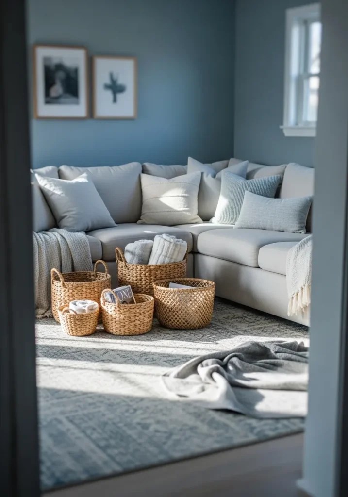 Smoke leans cool with a noticeable gray undertone, which helps the blue stay muted. That balance tends to work nicely with light sofas and woven textures like the baskets on the floor. Natural light usually brings out the blue side a little more. In softer lighting the shade settles into a quiet gray blue that stays easy to live with.