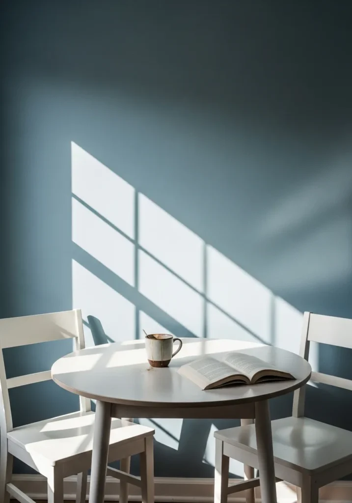 Quiet Moments has a soft blue base with a gentle gray cast that tones everything down. That mix tends to work nicely next to simple white furniture like the table and chairs here. Natural light usually pulls out more of the blue. In softer light the color leans quieter and slightly grayer, which many people find easy to live with day to day.