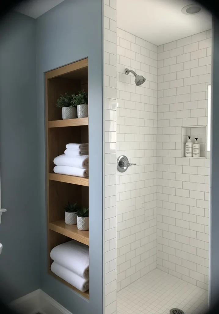 Mount Saint Anne carries a cool blue tone with a quiet gray undertone. That combination helps it pair easily with crisp white tile like the shower here. The gray side keeps the blue from feeling bright or overly coastal. In brighter bathrooms the blue becomes clearer, while softer lighting brings out more of the gray.