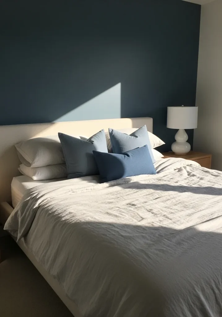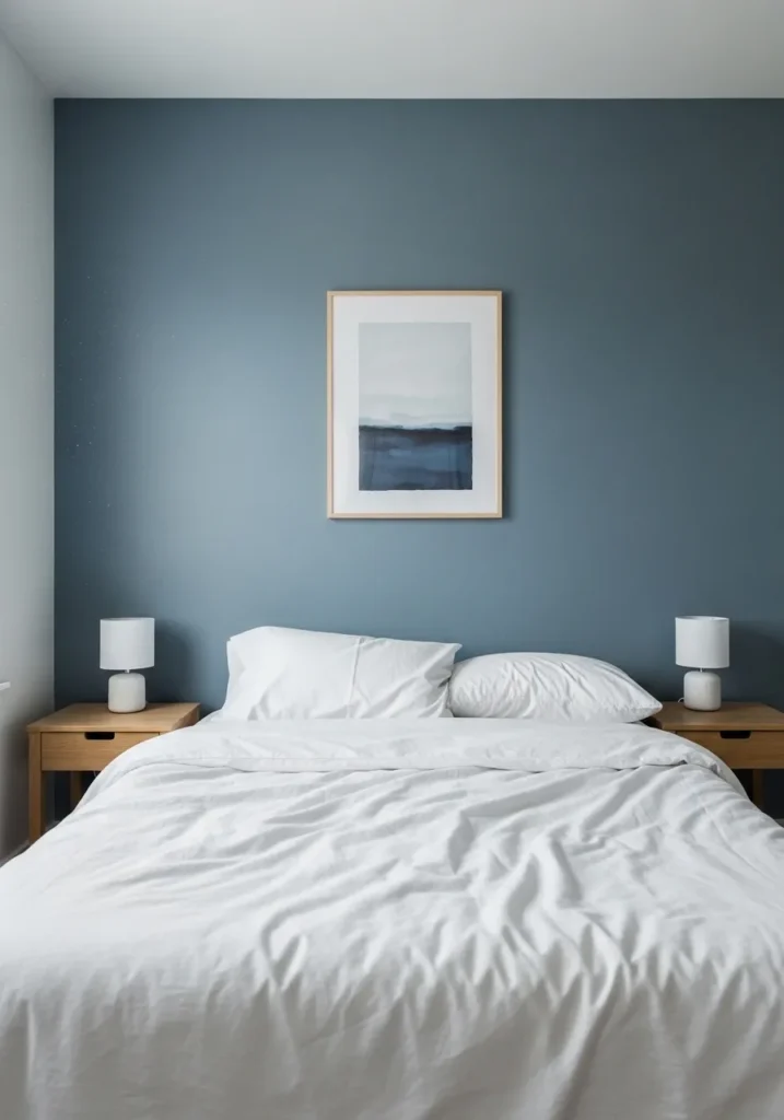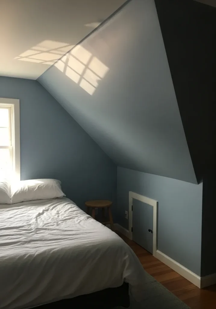 Boothbay Gray leans cool with a noticeable gray base. That gray undertone keeps the blue from feeling bright, which works nicely in quiet spaces like bedrooms. Next to white bedding and simple trim like you see here, the color tends to look clean and balanced. In brighter light the blue becomes a little clearer, while softer light brings out more of the gray.