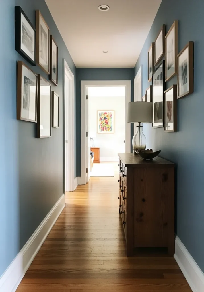 This wall color reads very close to Benjamin Moore Smoke (2122-40). It’s a steady blue gray that sits right between soft slate and muted blue. The shade gives a hallway a little color without making the space feel closed in, which can be tricky with long narrow areas.