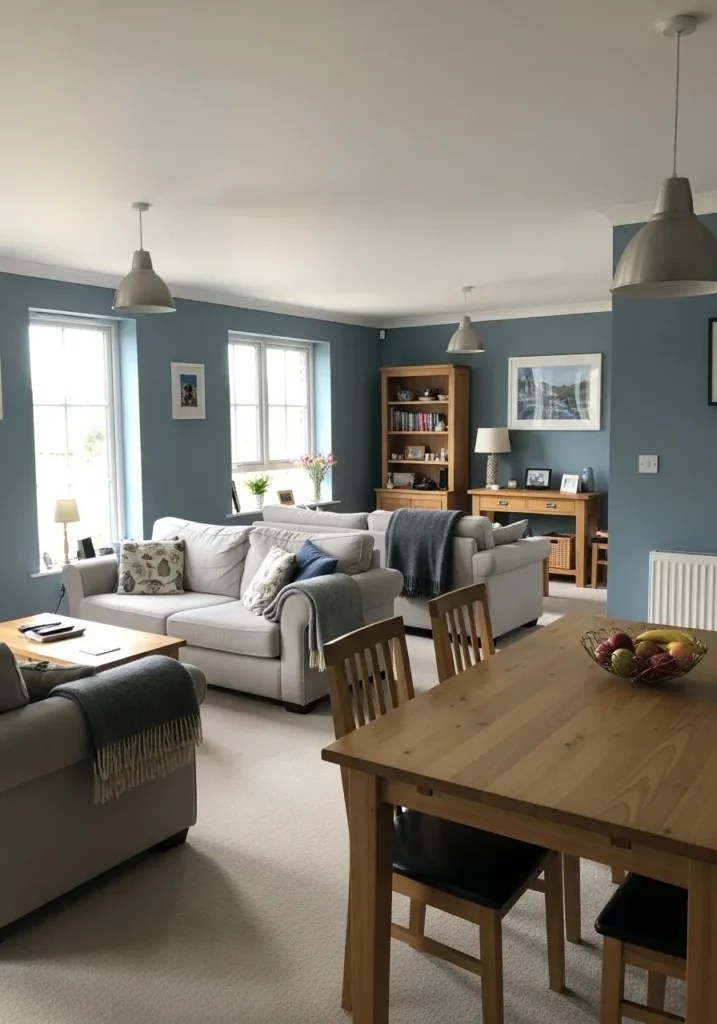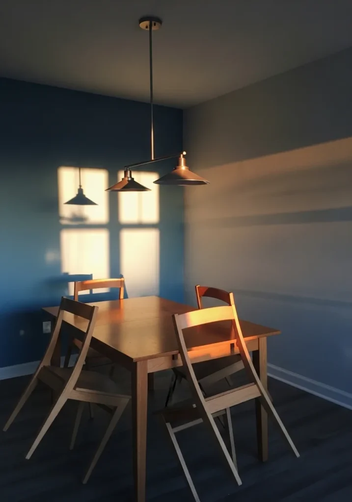 Normandy carries a cool blue base with a steady gray undertone. That mix tends to look good next to natural wood furniture like the table here, since the warmth of the wood keeps the color from feeling cold. In brighter rooms the blue becomes more noticeable. In lower evening light it settles into a richer gray blue, which many people like for dining spaces.