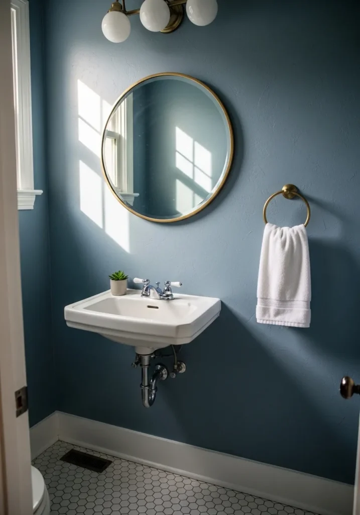 Van Courtland Blue carries a steady gray undertone that keeps the blue from feeling bright. That balance tends to work well next to crisp white fixtures like the sink and tile floor here. Brass accents also pair nicely with it. In brighter light the blue becomes clearer, while softer lighting pulls the color closer to a muted gray blue.
