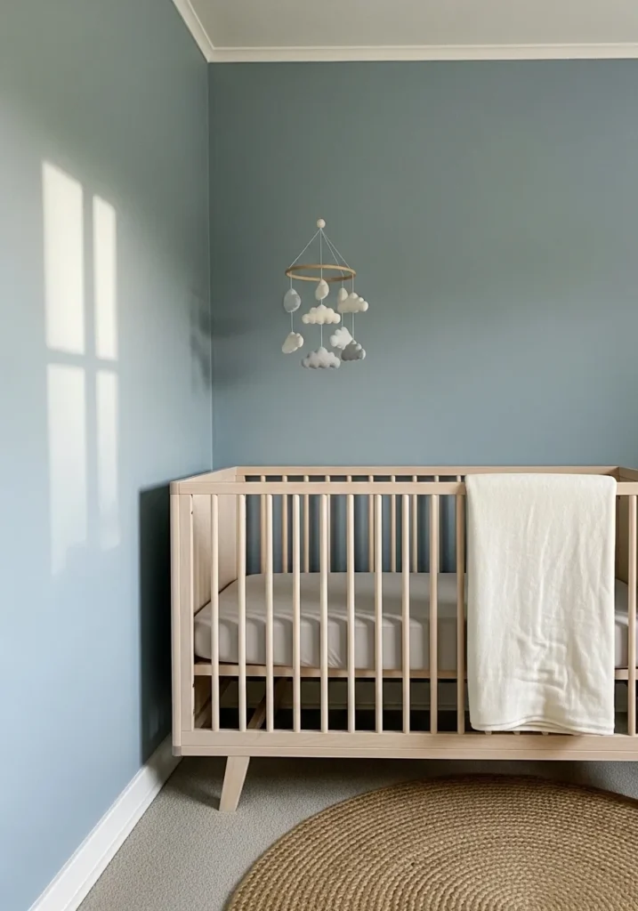 Woodlawn Blue carries a cool blue tone softened by a gray base. That gray keeps the color from feeling sugary, which is nice in a nursery where you want something calm but still grown up. Next to pale wood furniture and white trim like you see here, the color stays clean and easy. In brighter daylight the blue shows a bit more, while softer light lets the gray side come forward.