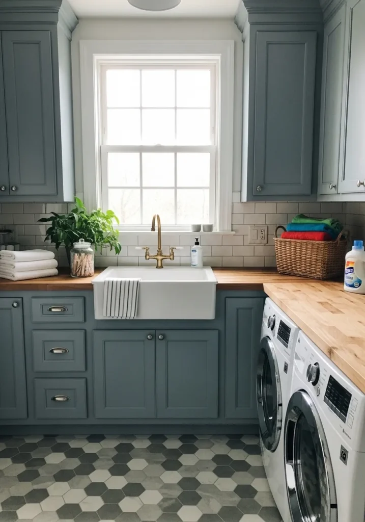 These cabinets read very close to Benjamin Moore Boothbay Gray (HC-165). It’s one of those blue grays that leans a little soft and dusty instead of bold. The color has enough depth to stand out on cabinetry but still feels calm, which is probably why people return to shades like this again and again.
