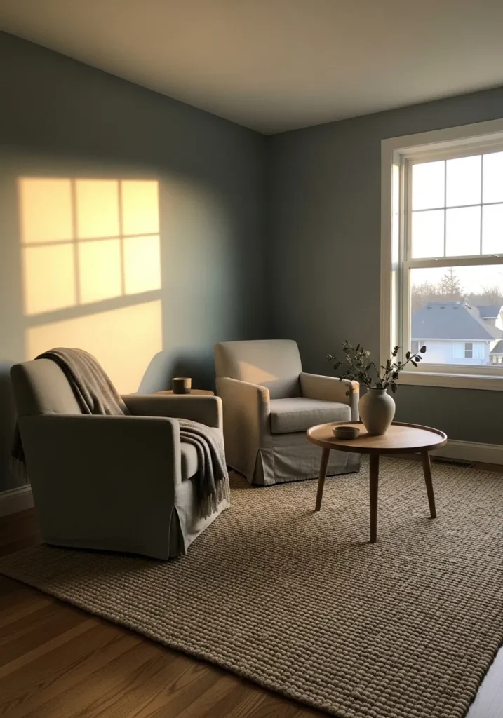 Quiet Moments carries a gentle blue tone with a noticeable gray base. That mix keeps it from feeling too coastal or bright. Next to pale wood flooring and light furniture like the sofa here, the shade tends to read balanced and easygoing. In brighter rooms the blue shows a bit more. In dimmer light it settles into a softer gray blue.