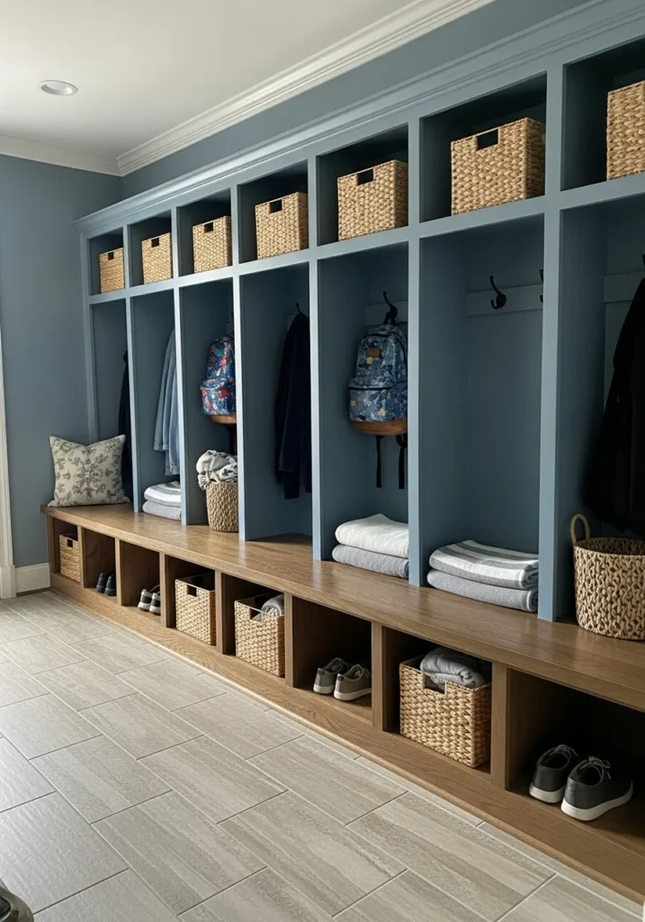 This built in color looks closest to Benjamin Moore Boothbay Gray (HC-165). It’s a medium blue gray that works nicely on cabinetry and storage walls where you want some color but not something too bold. The shade has enough depth to show up clearly, yet it still feels calm.