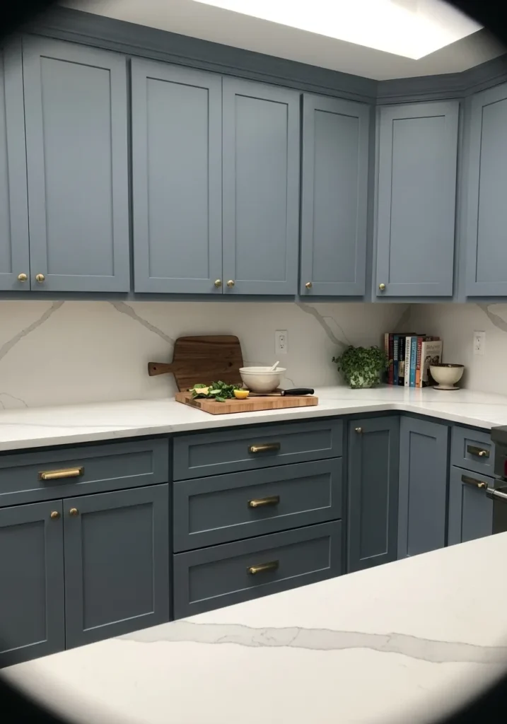 Boothbay Gray carries a gentle blue undertone with a steady gray base. That balance helps it sit comfortably next to light stone counters and brass hardware like you see here. In brighter kitchens the blue becomes a bit clearer, while cooler lighting can make it look more gray. Either way it tends to stay easygoing, which is exactly what many people want for painted cabinets.