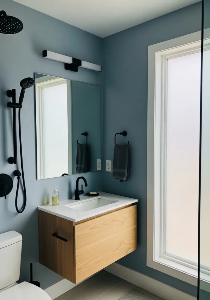 Smoke carries a cool undertone that becomes more noticeable next to crisp white trim and light countertops like the vanity here. The gray side keeps the blue from feeling bright or beachy. It usually works well in bathrooms, especially with black fixtures and natural wood finishes, since those materials help the color read balanced instead of overly cool.
