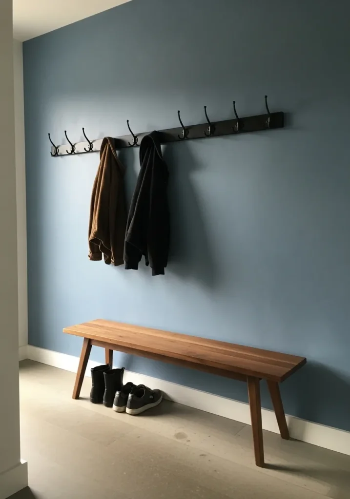 Boothbay Gray leans cool with a steady gray base, which keeps the blue feeling soft rather than bright. Next to warm wood like the bench here, the color tends to look balanced and natural. Black hardware and hooks also work nicely with it, since darker accents help the blue gray read a little richer.
