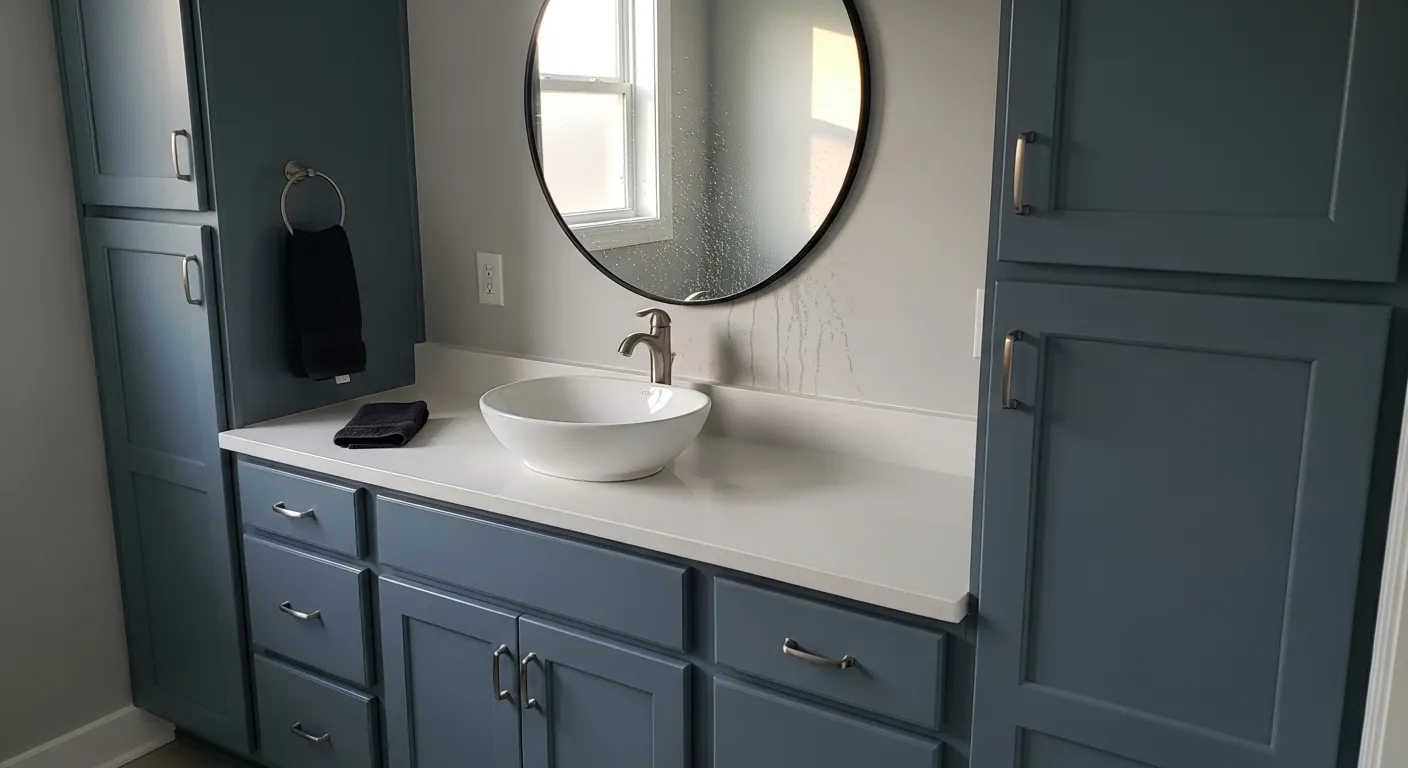 This cabinet color reads very close to Benjamin Moore Providence Blue (1636). It’s a balanced blue gray that sits right in the middle, not too dark and not overly soft either. The color brings a little personality to cabinetry while still feeling steady and easy to live with.