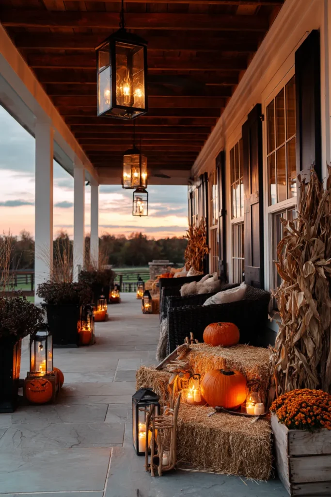 This wide farmhouse porch feels instantly welcoming with hay bales stacked neatly against the wall, glowing lanterns lining the floor, and pumpkins tucked in every corner. Corn stalks and autumn mums bring in a natural harvest touch, while the warm overhead lights cast a golden glow that makes the whole space feel like a perfect fall evening.