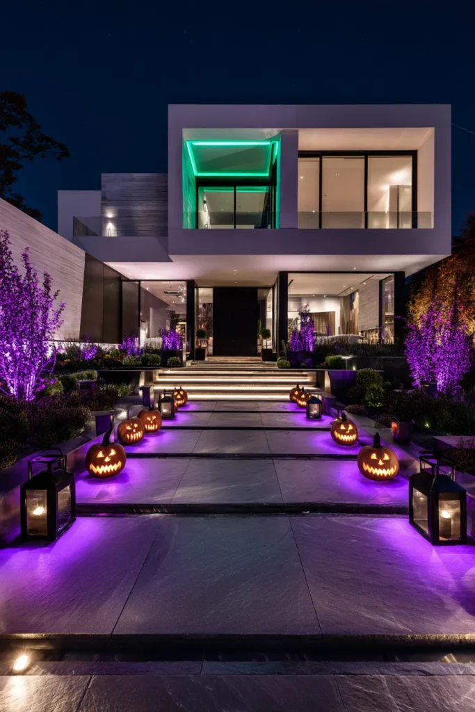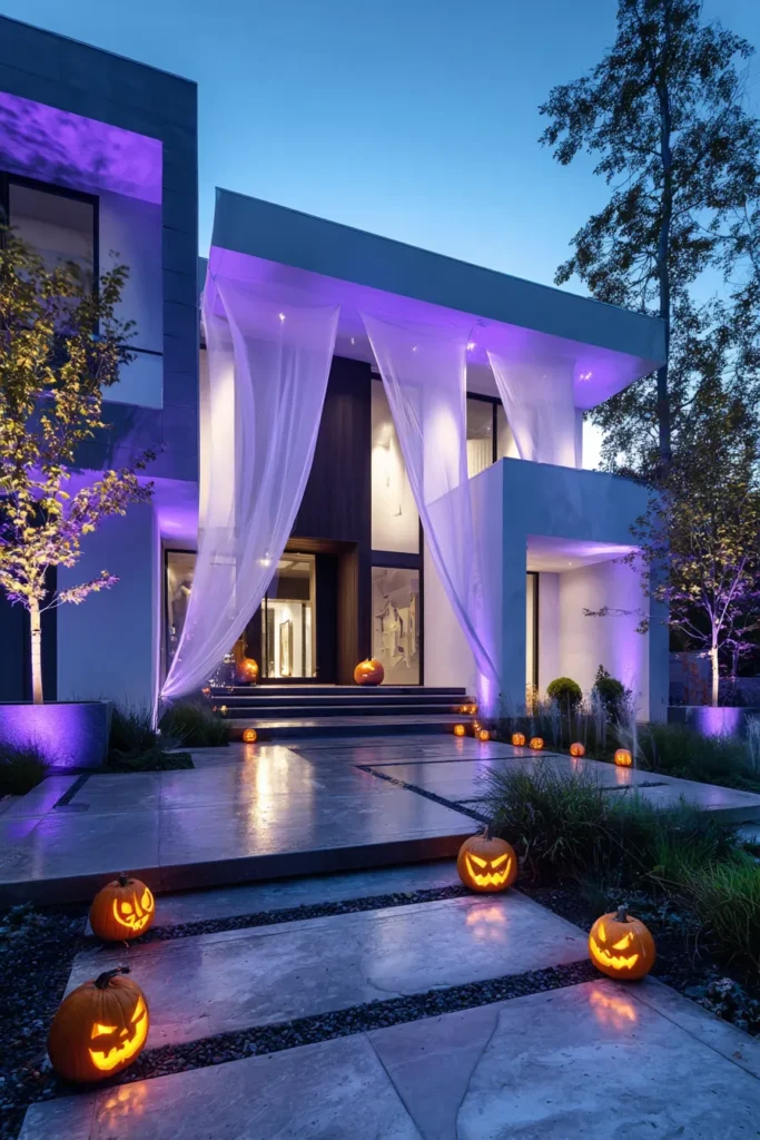 This sleek modern home takes Halloween décor in a glamorous direction with sheer white drapes flowing dramatically across the entryway and vibrant purple lighting washing the walls. Carved pumpkins with glowing faces line the walkway, their flickering light bouncing off the smooth stone path leading to the front door.