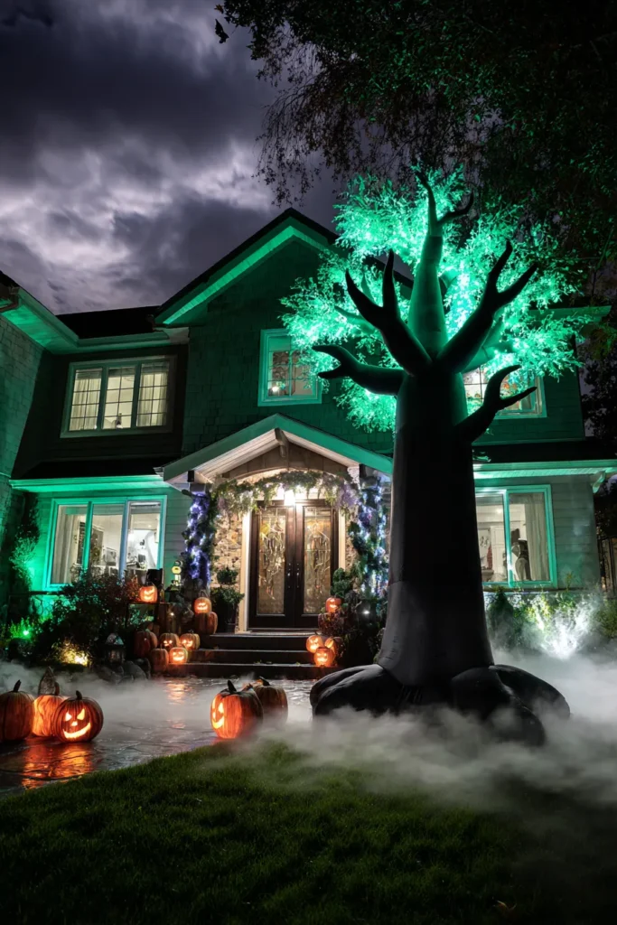 This classic two-story home gets a chilling twist with an inflatable haunted tree standing tall in the front yard, glowing with eerie green light. The walkway is surrounded by jack-o’-lanterns with mischievous grins, while fog rolls across the lawn to create that spine-tingling Halloween atmosphere.