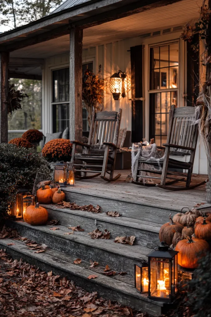 This sweet country porch is dressed for fall with rustic rocking chairs, cozy lanterns, and pumpkins scattered along the steps. Dried leaves add to the seasonal look, while soft candlelight gives everything a warm flicker that feels simple yet magical.