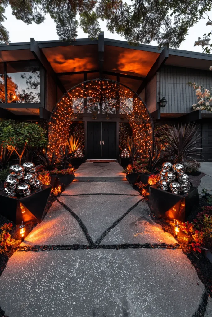 This modern entryway is transformed with glowing orange string lights forming an archway that sparkles against the night sky. On each side of the walkway, metallic skulls shine from bold black planters, giving the scene an edgy yet polished Halloween look.